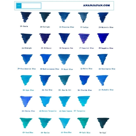 Mực Diamine 30ml được đóng trong lọ nhựa. Đặc điểm nổi bật của bộ mực là có số lượng cực " khủng": 105 màu. Mực chảy đều và khô nhanh. Mức giá hợp lý nên rất được ưa thích để viết hàng ngày hoặc ký.