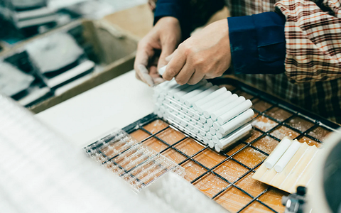 Phấn bảng không bụi của Rikagaku được làm từ bột mịn vỏ sò điệp, thân thiện với con người và môi trường. Thành phần chính là canxi cacbonat, một chất cũng được sử dụng trong kem đánh răng nên cực kỳ an toàn. Những hạt nặng và bột phấn không dễ phân tán, giúp hạn chế tối đa việc làm ố quần áo hay bám bụi vào không gian xung quanh. Đây là giải pháp an toàn không chỉ cho người sử dụng mà còn cho cả người sản xuất chúng.