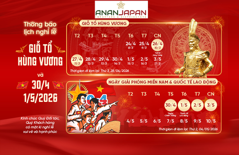 Công ty Ananjapan trân trọng thông báo lịch nghỉ Lễ Giỗ Tổ Hùng Vương (10/3), Ngày Thống nhất đất nước (30/4) và Ngày Quốc tế Lao động (1/5) như sau: