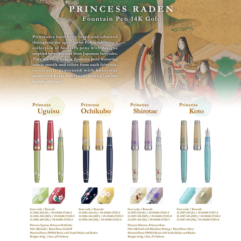 Princess Raden Fountain Pen 14K 11-3506/3507 Công chúa Uguisu: Công chúa Uguisu là một chiến binh bụi rậm, sống cải trang dưới hình dạng con người.Một ngày nọ, cô tiếp một vị khách trẻ tuổi và yêu cầu anh ta đừng...Xem thêm